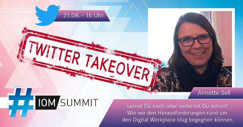 Dieser TwitterTakeover ist schon vorbei. Hier können Sie die Diskussion einsehen. Nach einem spannenden TwitterTakeover mit Oliver Ewinger am 14. August zum Thema #Netzwerken, startet am Mittwoch der nächste TwitterTakeover mit Annette Sell, bei dem Sie für einen Tag lang den Twitter Account von @iomsummit übernimmt und mit der Öffentlichkeit zum Thema #Lernen & #DigitalWorkplace diskutiert. Annette Sell: Ein Merkmal des Digital Workplace ist die Vielzahl an Tools, die uns begegnet, verbunden mit einer schier unendlichen Flut an Information und Wissen. Was bedeutet das für unsere Lernfähigkeit? Müssen wir vielleicht das Verlernen lernen, um klug mit diesem Thema umzugehen? Ich persönlich bin überzeugt - die Fähigkeit des Lernens (und Verlernens) wird für unsere weitere Zukunft mehr und mehr an Bedeutung gewinnen – eine positive Haltung zum lebenslangen Lernen wird aus meiner Sicht daher immer wichtiger. Also: „keep calm and learn on!“